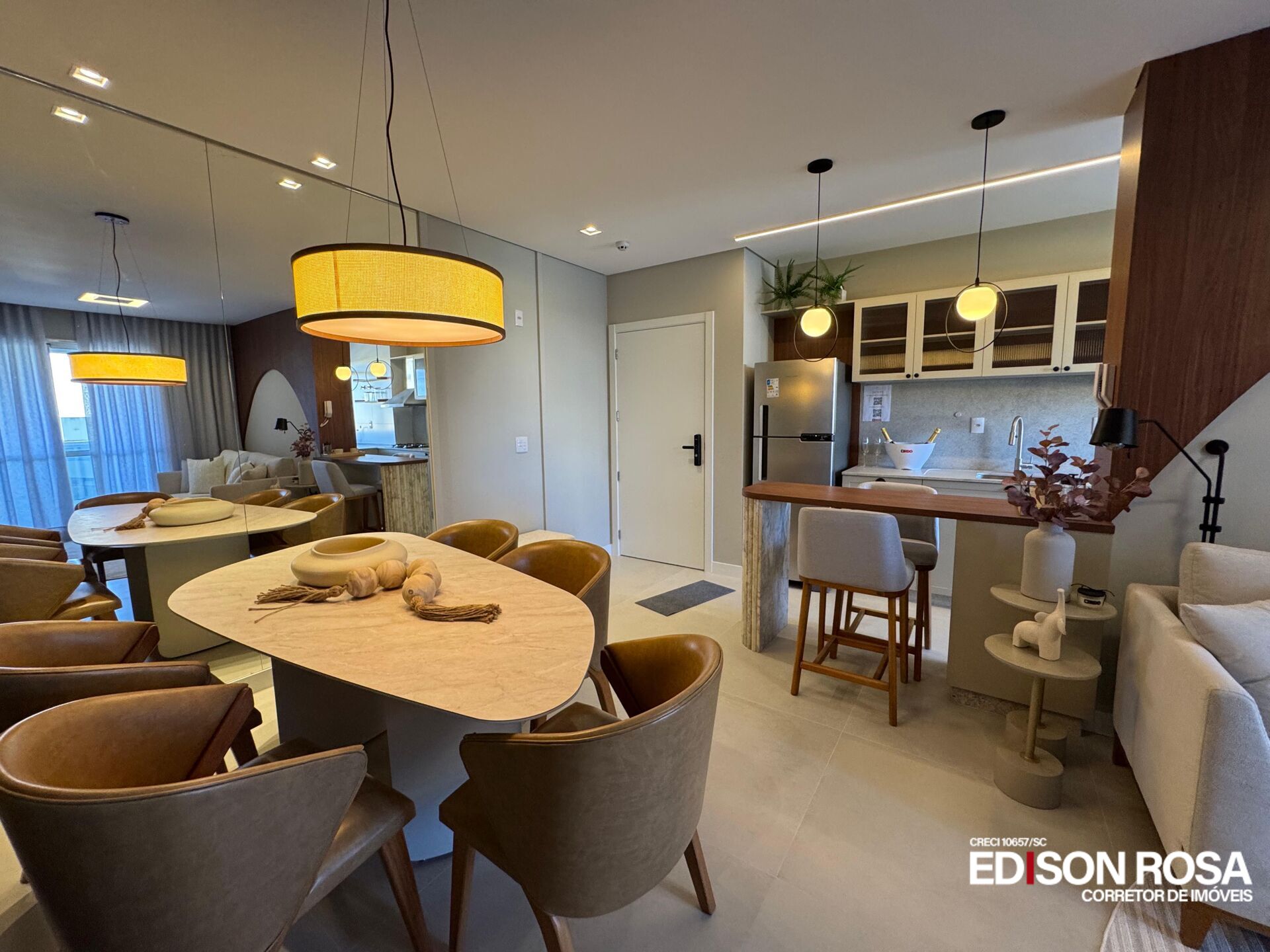 O condomínio conta com uma área de lazer e convivência mobiliada, decorada e climatizada.